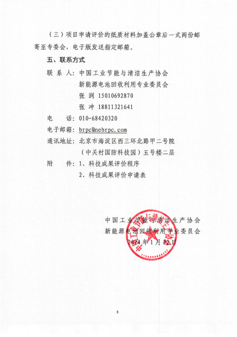为全面贯彻落实党的二十大精神,充分发挥科技成果评价作用,以评价助创新、促转化,中国工业节能与清洁生产协会新能源电池回收利用专业委员会负责组织开展2024年新能源电池回收利用领域科技成果评价工作,通知文件如下:
