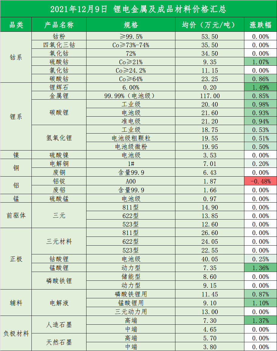 2021年12月9日电池材料价格